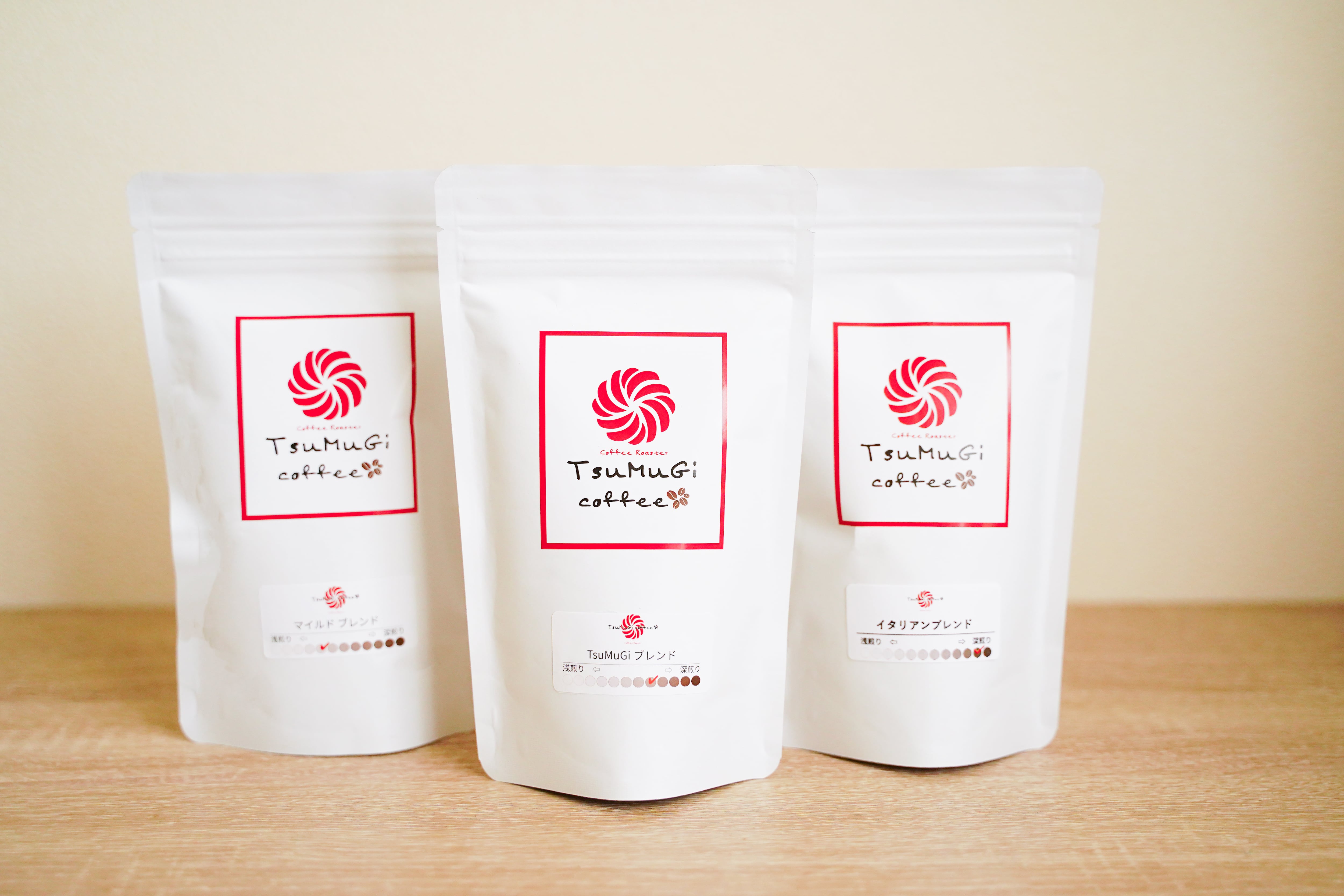 ・コーヒー豆100g×3種類(マイルドブレンド(中煎り)×100g、TsuMuGiブレンド(中深煎り)×100g、イタリアンブレンド(深煎り)×100g)